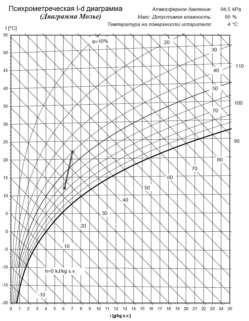 3) спуститися по осі ординат до точки перетину з графіком 95% відн. вологості;